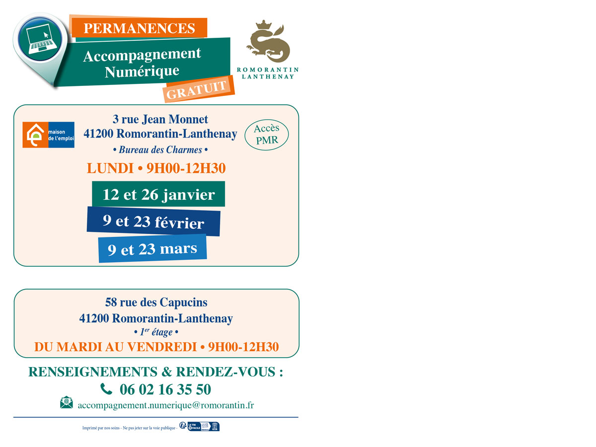 Prochaines permanences à la Maison de l'Emploi les lundis matin de 9h00 à 12h30 sur RDV au 06 02 16 35 50 :